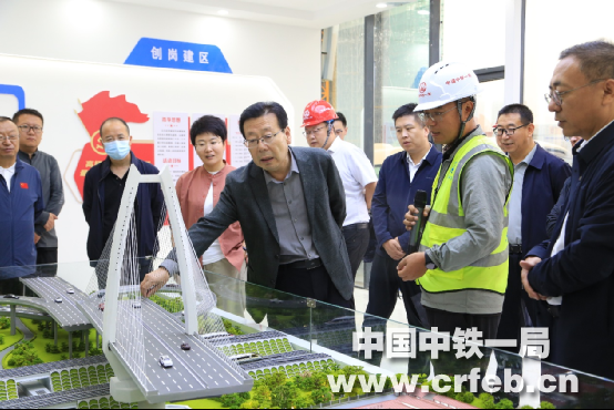 在施工現(xiàn)場(chǎng),調(diào)研組聽取了中鐵一局項(xiàng)目負(fù)責(zé)人程曉剛關(guān)于項(xiàng)目概況、建設(shè)意義、施工進(jìn)度、重難點(diǎn)推進(jìn)情況等方面的匯報(bào),饒有興味地參觀了工地現(xiàn)場(chǎng)的智慧中心,觀看了轉(zhuǎn)體橋的沙盤演示和施工動(dòng)畫,了解了項(xiàng)目在整個(gè)區(qū)域交通網(wǎng)絡(luò)中的位置和重要作用,以及轉(zhuǎn)體橋從前期準(zhǔn)備到轉(zhuǎn)體施工、再到最終合龍的全過程,對(duì)項(xiàng)目建設(shè)情況有了全面直觀的了解。